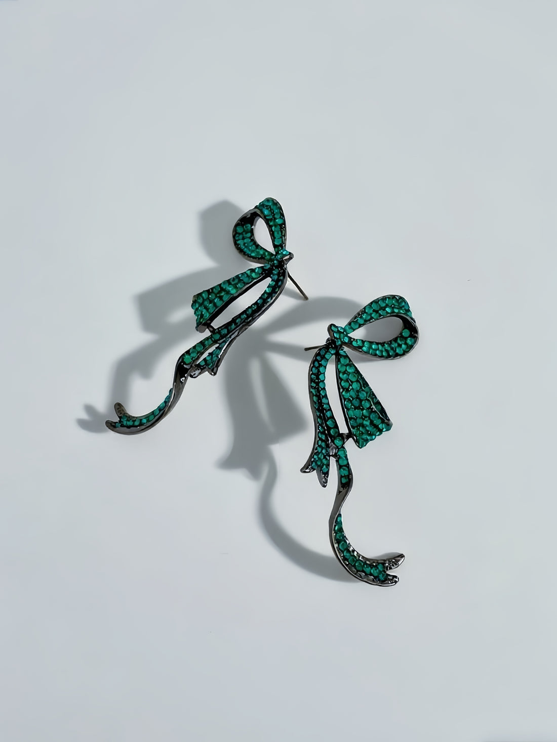 Make a dazzling statement with these emerald ribbon earrings. Adorned with sparkling emerald-colored stones in...