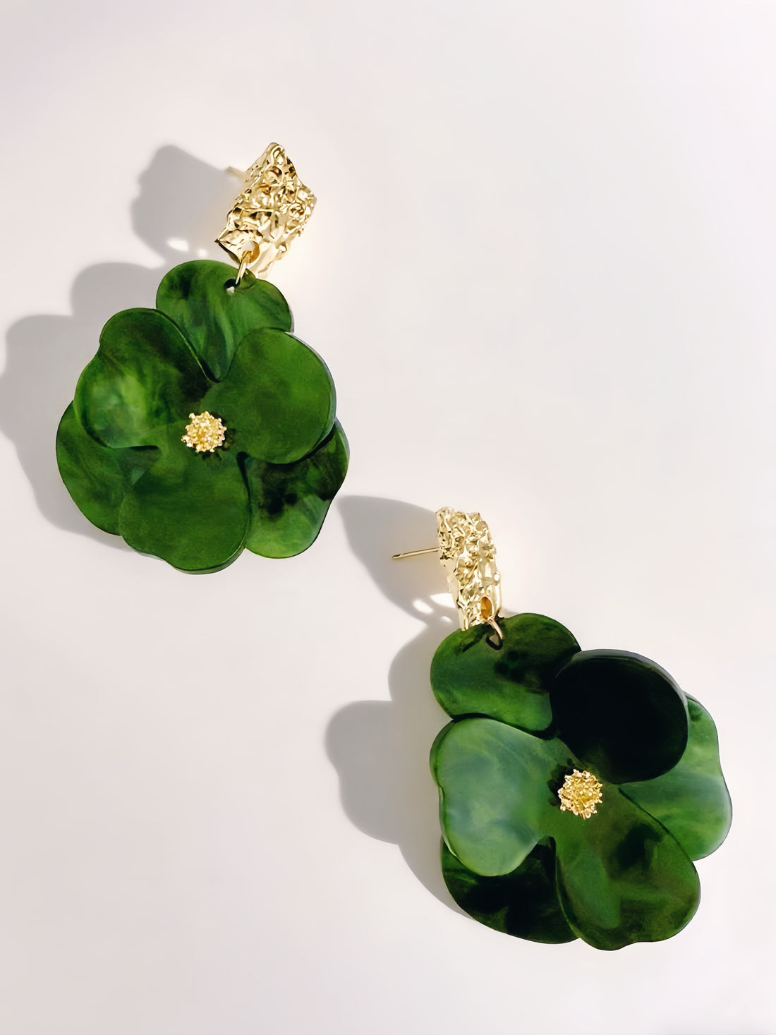 Embrace botanical charm with these unique floral stud earrings. Crafted from marbled moss-green resin, their...