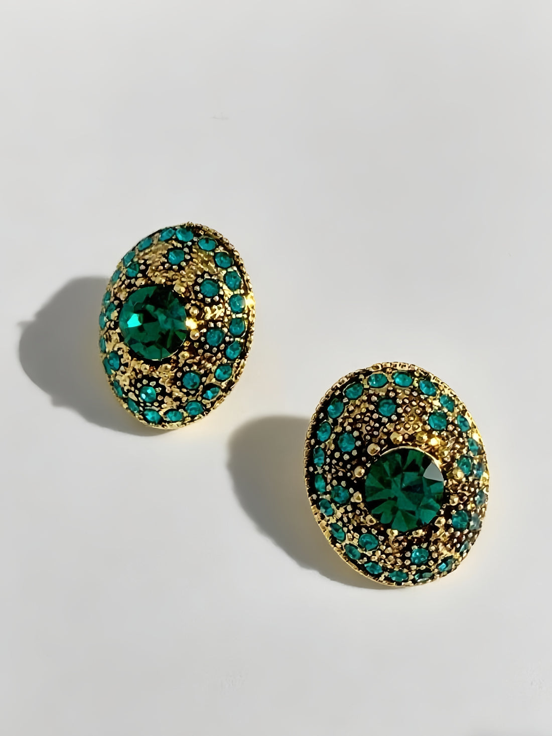 Shine bright with these captivating halo stud earrings. Featuring a central emerald-hued stone surrounded by...