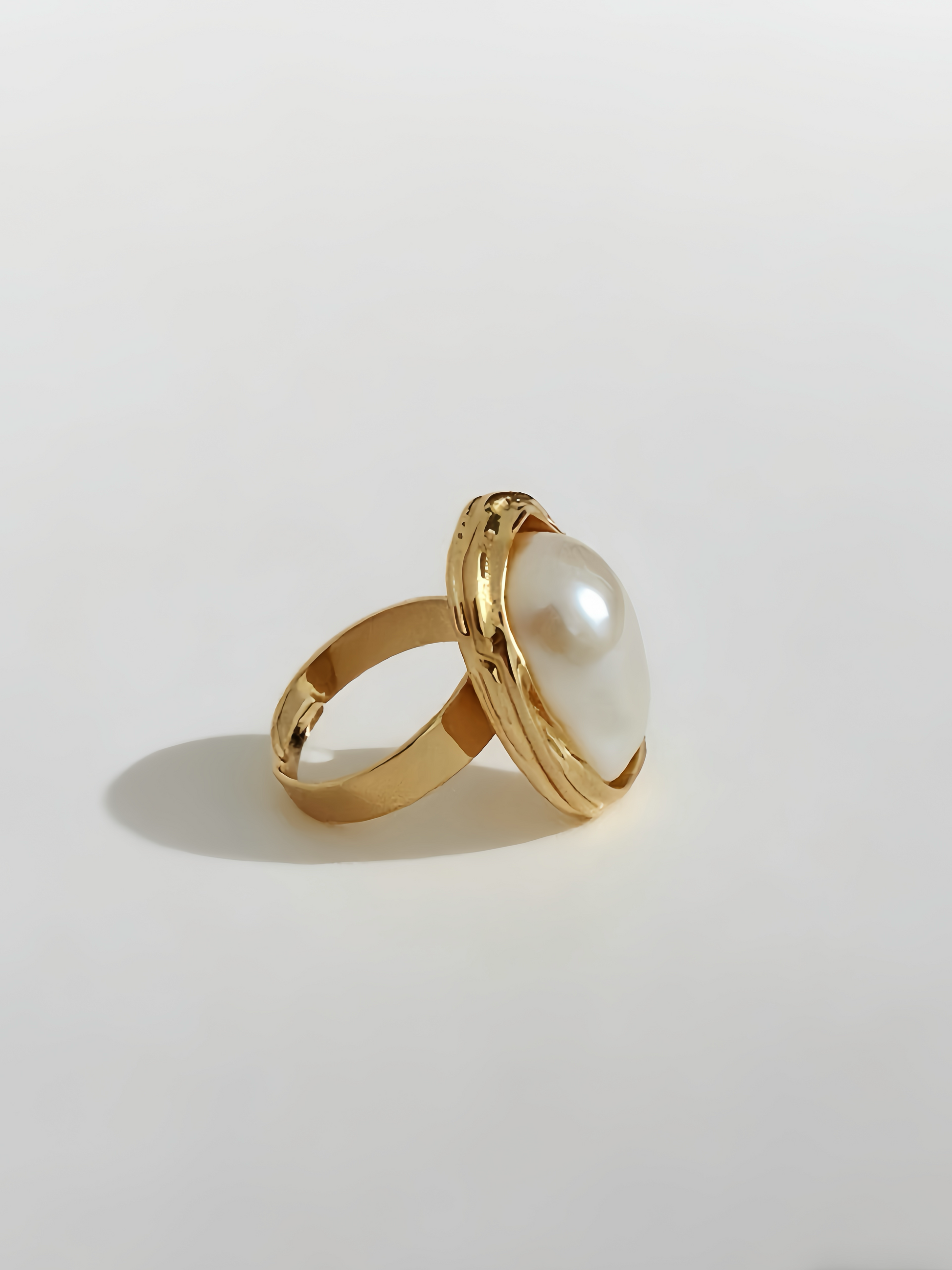 A bold and unique statement piece. This adjustable ring features a prominent baroque pearl with an iridescent luster, set in a hammered gold-tone frame. Its modern, organic design adds an effortless touch of sophisticated elegance to any look.